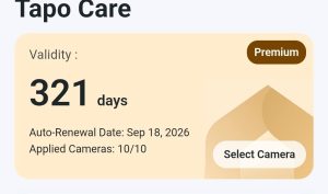 The current pricing for Tapo Care is either $3.49 per camera per month or $32.99 per year. You can also select a “mega” plan which supports up to 10 cameras for $11.29 monthly or $112.99 yearly.